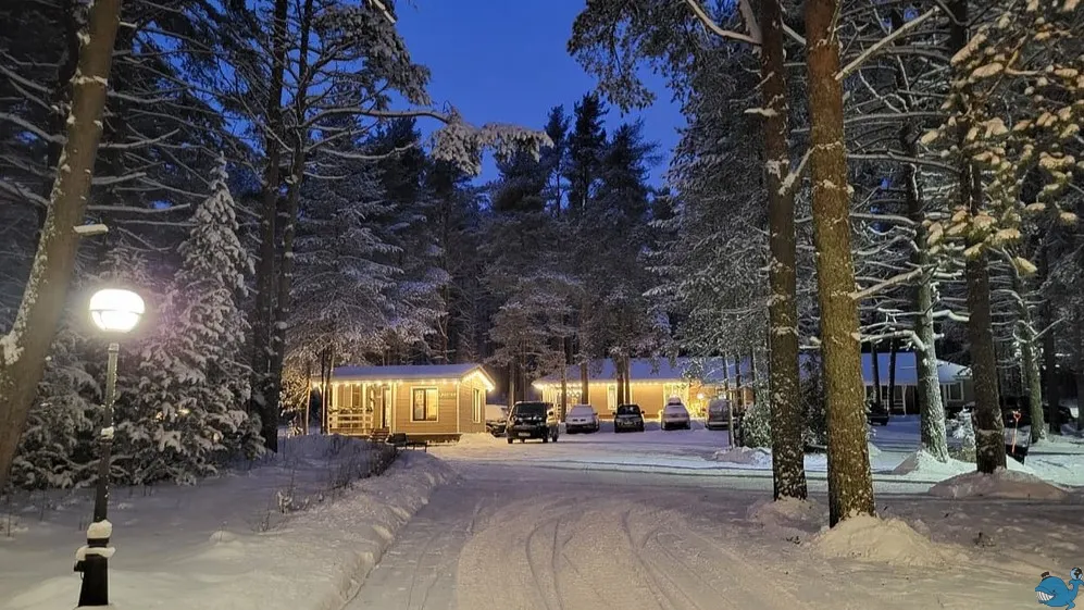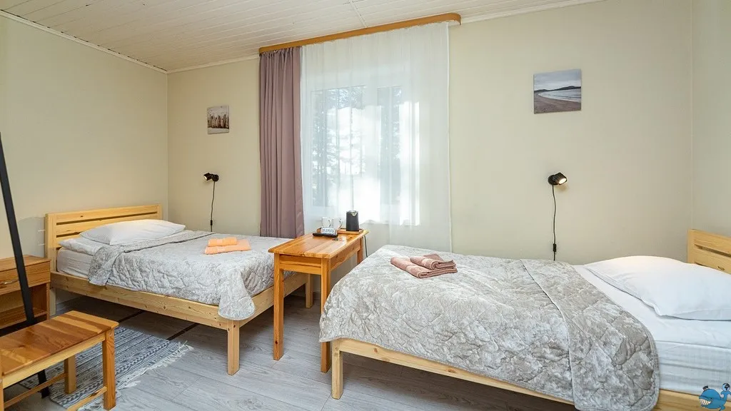 Размещение в номерах с удобствами. База имеет хорошую инфраструктуру – банный комплекс, беседки, ресторан, прокат снегоходов.